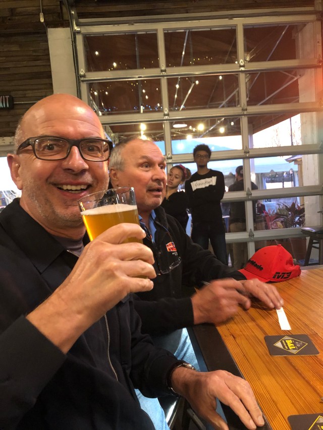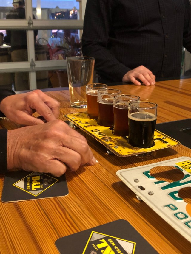 We head into the bar and grab four seats in front of the massive digital menu (2 large screen TVs mounted on the wall) where dozens of craft beers are described. The hipster bartenders pass out modified license plates that will hold the tasting flights and a slip of paper where you can choose up to 4 beers to sample. The selection is mind boggling. With our choices made we ask the bartender if anyone can give us the 411 on the brewery. Moments later a chipper dude invites us into the brew tank area for an info session. We are joined by the owner (a former male nurse) who, along with chipper dude, is responsible for brewing. We hear the story of IPA and it’s beginnings and the history of beer in general among other interesting facts such as how they got their name. A fanciful tale in itself that would make the queen smile.