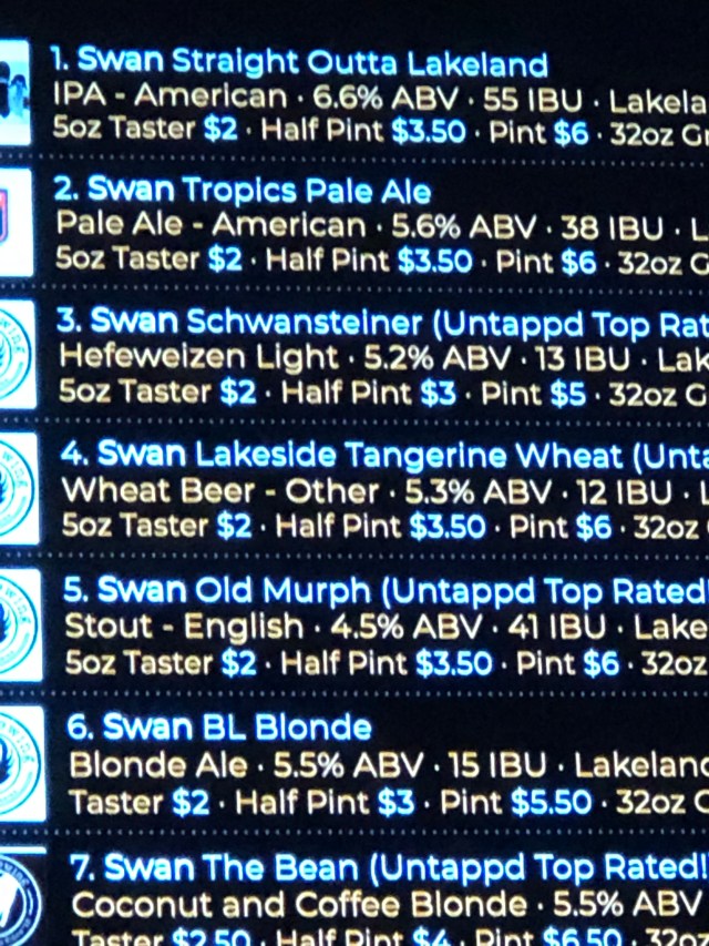The Swan turned out to be an immediate hit because it’s pet friendly (we make special note of these places) and the amazing sunset over the lake added allure as well. There was a huge outdoor event tent out front to provide an al fresco eating area as they feature a resident food truck. Both inside and outside were busy. It was trivia night.