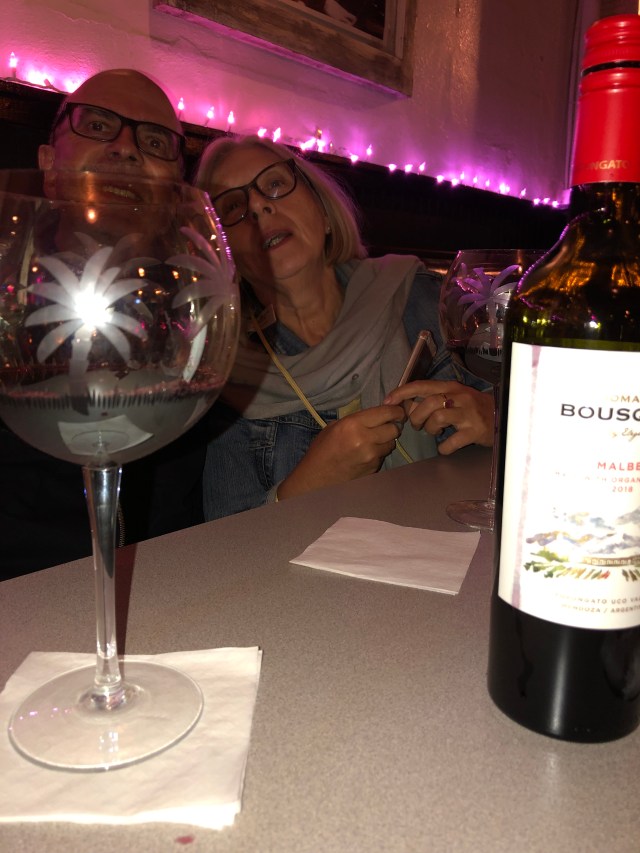 A mature man, neatly dressed and coiffed, approaches us. Hi … I’m Cal he says. A bit of small talk and we see him move along to chat with the owner. We assume he’s on staff or otherwise connected. He then sits and seems to study sheets of paper. I comment that he looks like he’s getting ready for an exam. Odd.