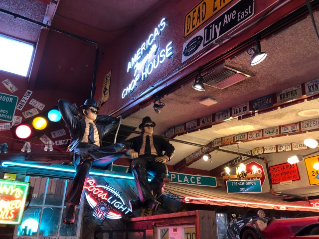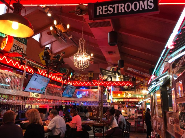 Once we are shown to our seats we take in the surroundings… retro “junk” is everywhere. License plates, signs, posters not a bare piece of wall or ceiling to be found. There’s an old fashioned help yourself to popcorn machine and the place is buzzing in general. Every table is taken. Our server, Pearl (that’s right, Leah, an actual Pearl. And she was young and spunky!) gives us menus and offers drinks. Bails orders a Margarita and Rudy and I order red wine.