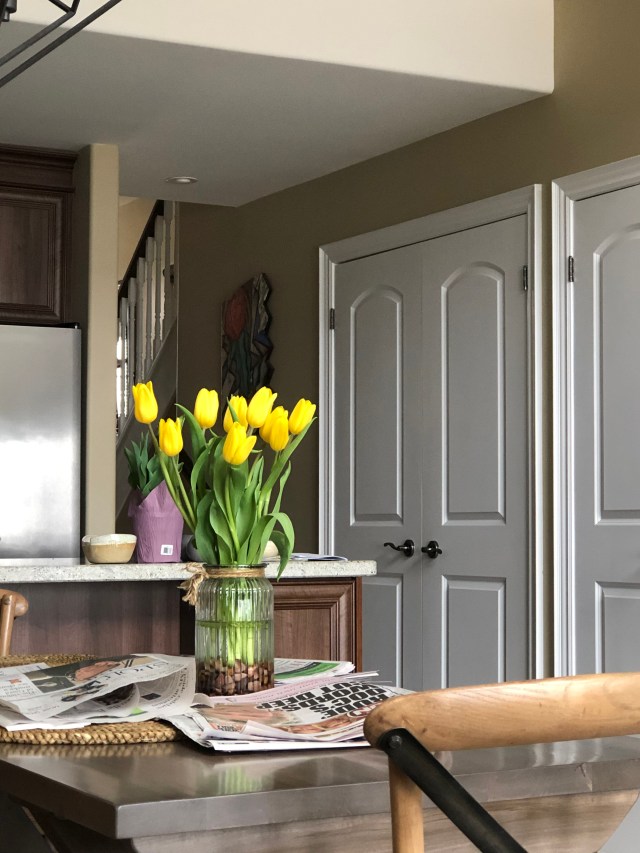 The kitchen is fully equipped and functional with gleaming granite counters. The Florida kitchen was white (appliances and sink) with laminate counters and cupboards with no handles. I really missed my kitchen. Our first meal back home was roast beef and mashed potatoes. With wine in decent glasses. And candles and fresh tulips and the fireplace glowing (yes … cold enough for a fire). Sigh.