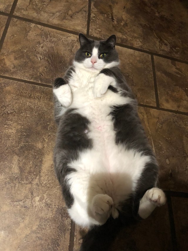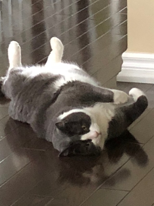 But Otto is a cool cat as his nickname suggests. He’s also huge. So huge that his legs look shorter than they really are which you can see when he’s stretched out full length on the sofa. Otto is really good at three things: eating, sleeping and using the litter box. He’s also good at: purring, snuggling (at his convenience) and finding unusual and random places to nap.