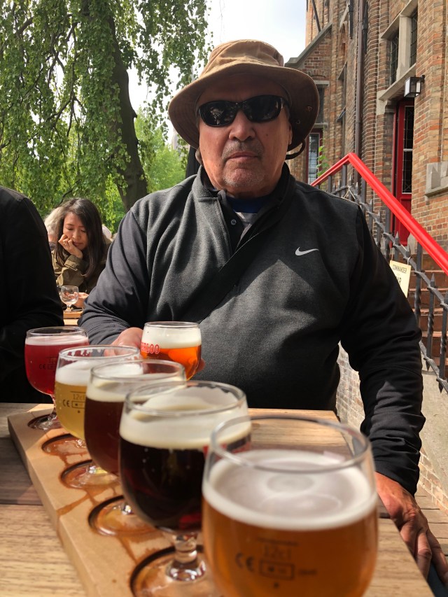 At the end of the tour we back track to the brewery we passed on the water. We enjoy a tasting flat of local beers on the waterside patio. And then continue our stroll back to the market plaza via a chocolate store. We meet the owner who empathizes that we can’t schlep anything major back home and offers a shipping (pay with PayPal) solution. US or Canada. But US is half the price. Go figure.