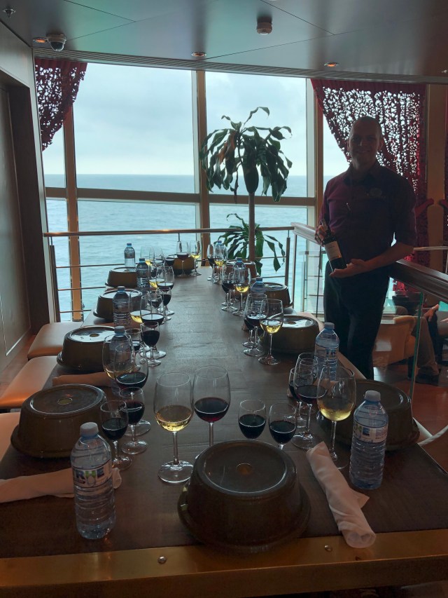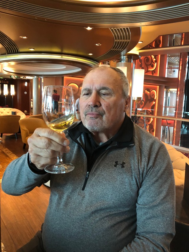 There’s a nice cozy bar on board the ship called Vintages and two of the four ship’s sommeliers work there. Denis is from Russia and Natalia is from Costa Rica. We enjoy sipping drinks at this bar because the view is good and it’s not overly busy. They have only a limited bar selection: wines and whiskey. So it’s perfect for us. Denis has brought the wine tasting to our attention and we are intrigued.