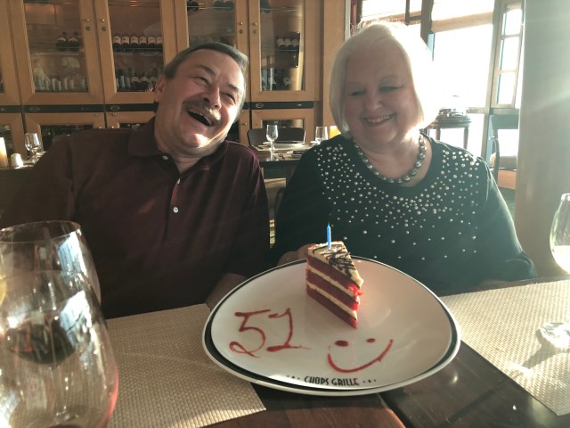 On our last cruising day it is their 51st wedding anniversary and they ask us to join them for a special dinner in one of the premium restaurants on board, Giovanni’s. The restaurant has floor to ceiling windows allowing the intense sunset to lighten the room in an ethereal way. The waiter (familiar to Bonnie and Dan) starts us with olive oil/balsamic/Parmesan and warm crusty bread. Then the charcuterie board and pickled vegetables arrive. We toast the anniversary couple and place our dinner orders. Osso Bucco and filet mignon are recommended. The next course is appetizers; the table shares a delicious caprese style salad and I can’t resist the pork belly. By the time entrees arrive I am stuffed.