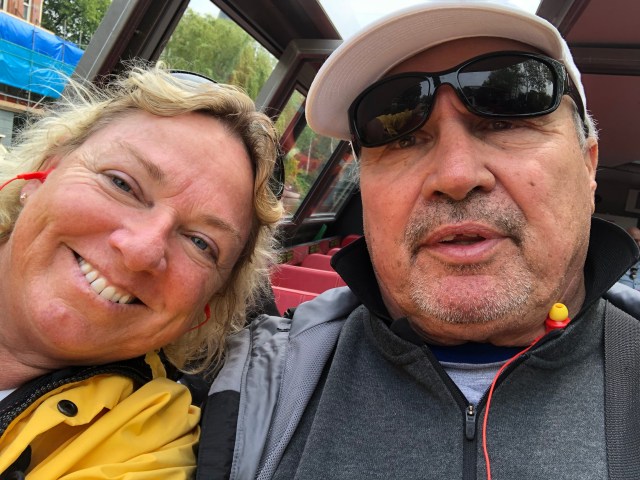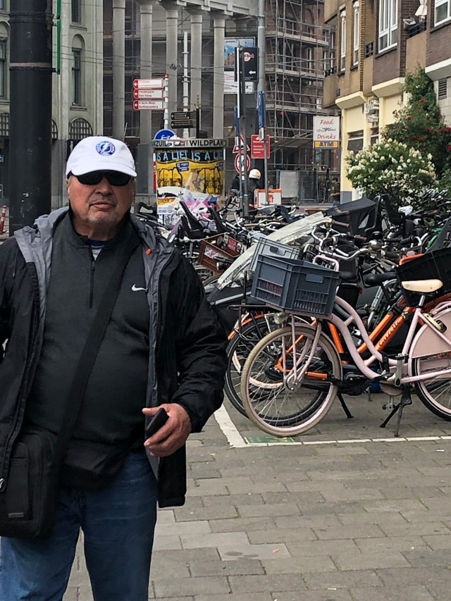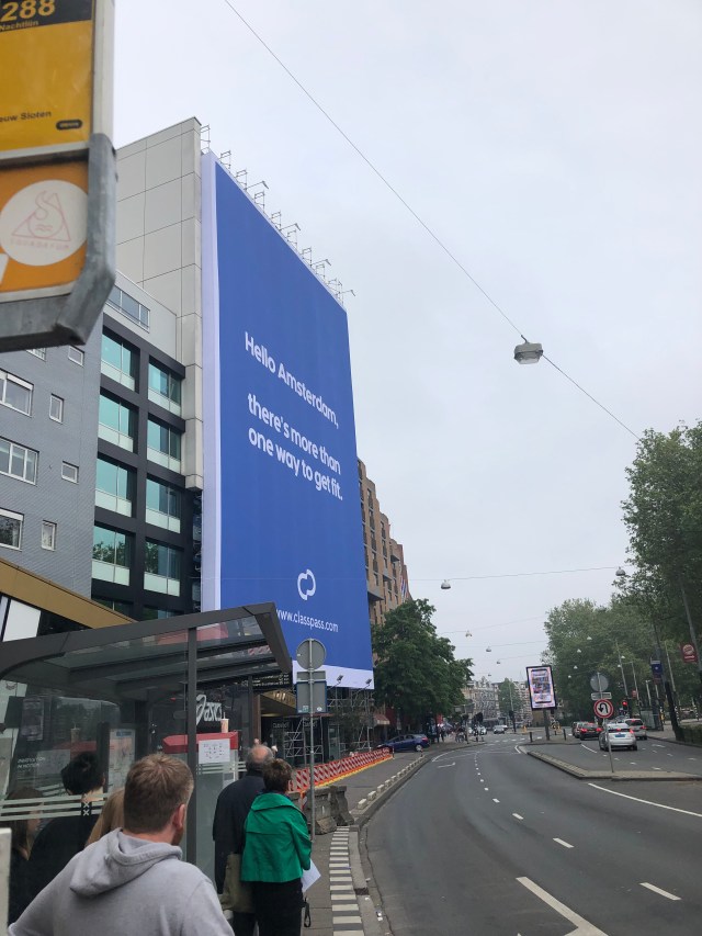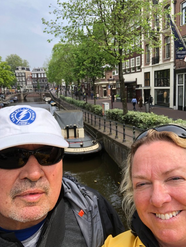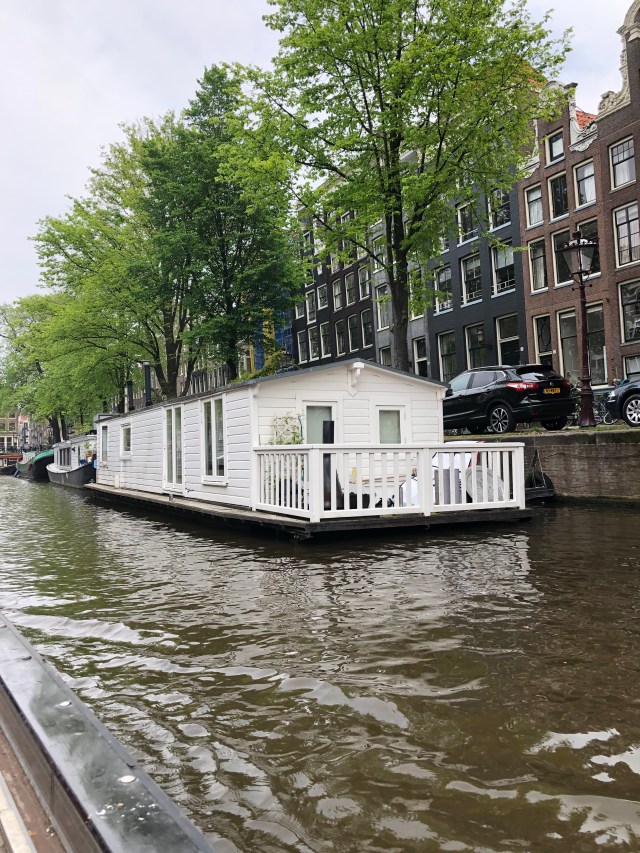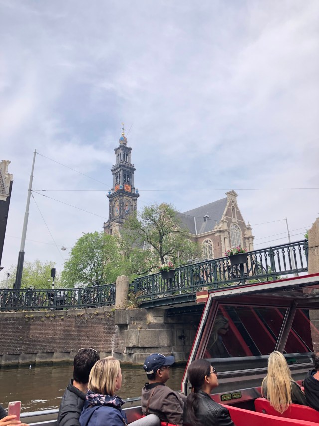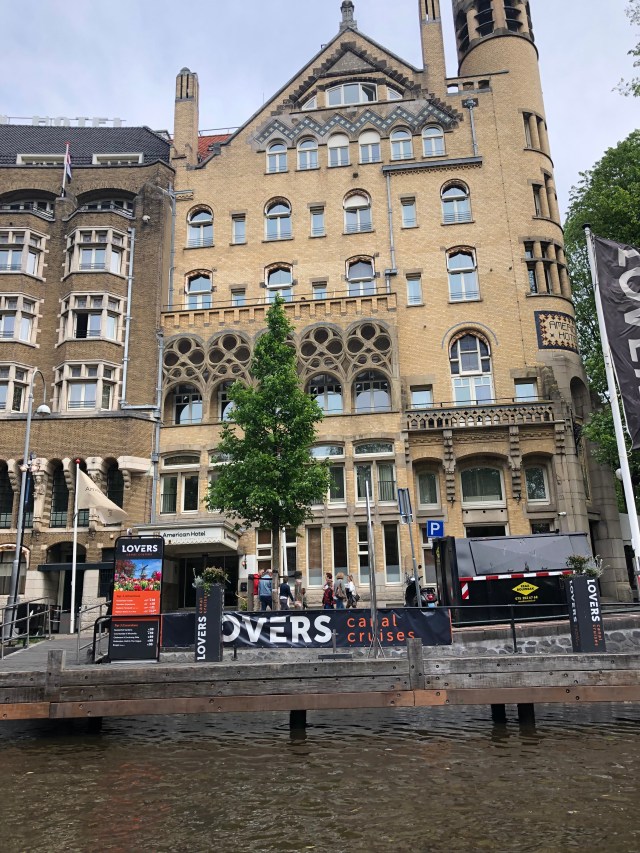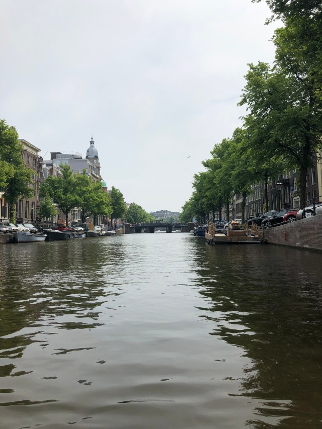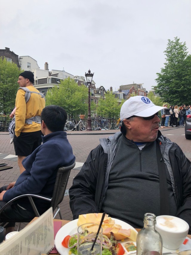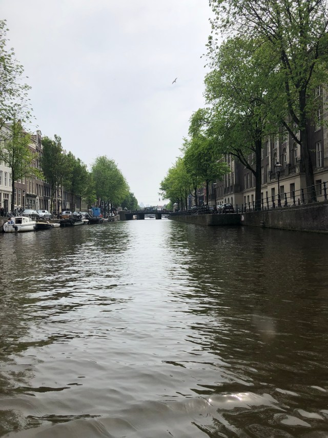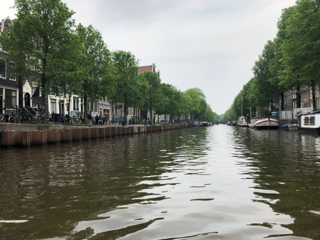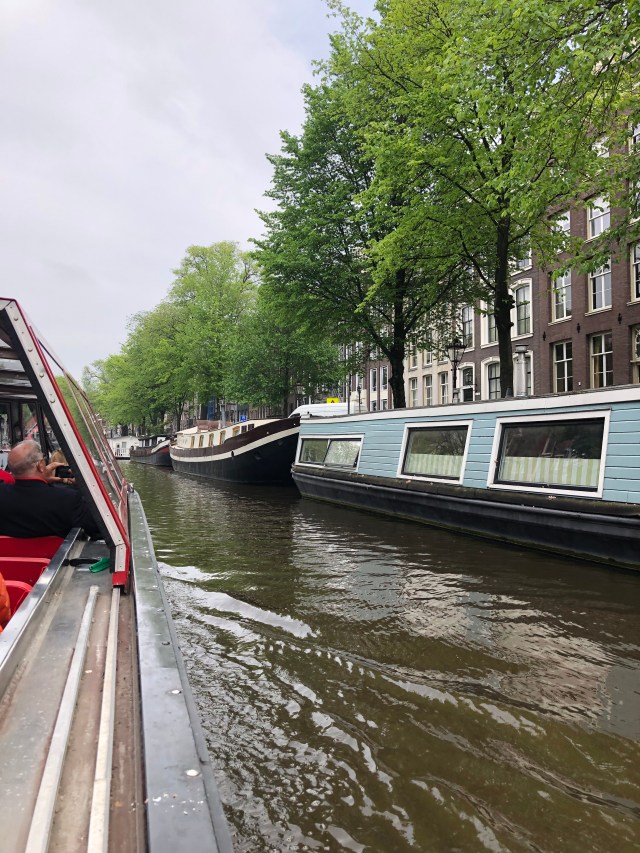 The hop on bus is a short walk away and we get to the pick up point. The sky has lightened a bit but the air pressure is still low. Smells and sounds are trapped under the gray dome. Most hop ons are open at the top level, but this one had a plexiglass cover. We take our seat and I try to open the window without success. Earplugs are provided and there’s audio in 16 languages. Amsterdam is built around the water like a spiderweb with streets and canals making up the spokes. At the first opportunity we move seats to sit next to an open window. However, fixing one issue has created two more: the couple behind us are coughing and the man in front of us bathed in Axe cologne. It’s a sandwich from hell.