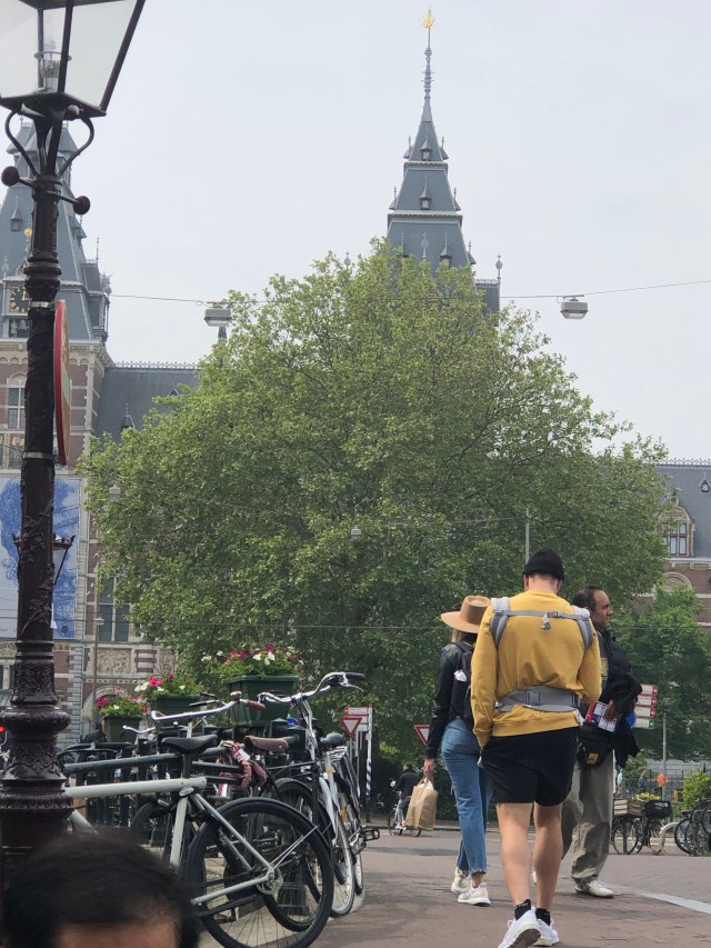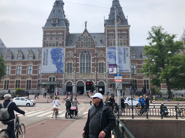We finish with the clerk who prints tickets for the hop on/hop off bus and boat and stores our bags. He rapidly circles points of interest on a city map and shows us where we are. We are a block from the Rijks Museum.