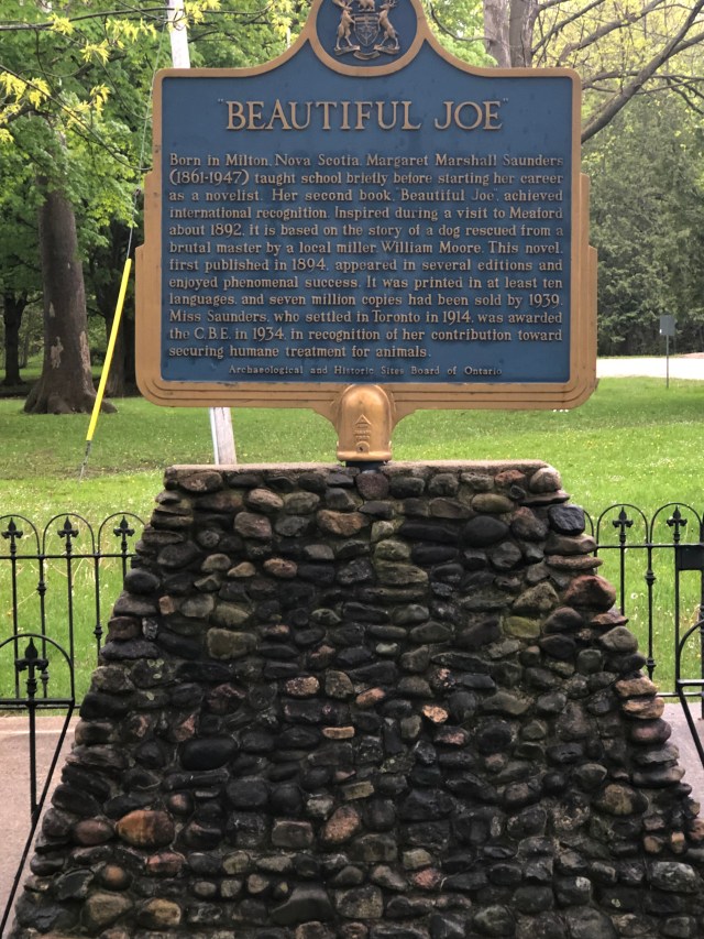Meaford is a quaint shore town on Georgian Bay not to far from our place. About 18 km – 20 minutes or so. Nestled among older homes and next to the river flowing into Georgian Bay is a lovely shady park dedicated to Beautiful Joe and his canine comrades.
