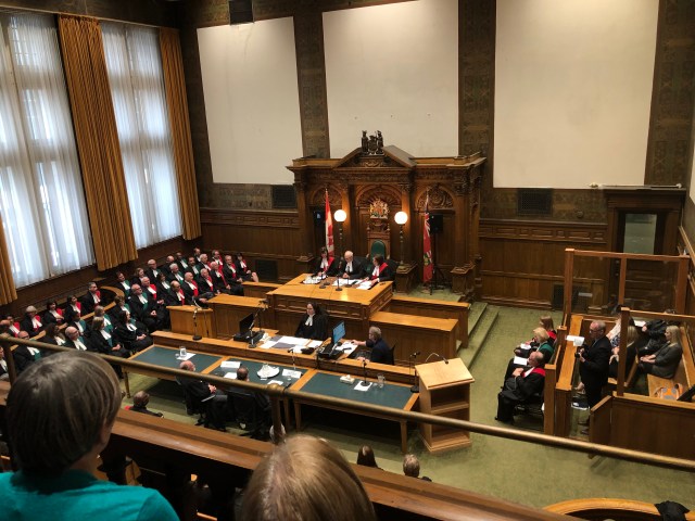 The courtroom gallery spectators rise and a procession of robed judges files in. The court clerk recites the opening remarks in English and French. And everyone takes their seat. There was no anthem or conspicuous flag in the courtroom but I’m almost certain I heard the clerk mention the queen. Interesting. Please be seated.