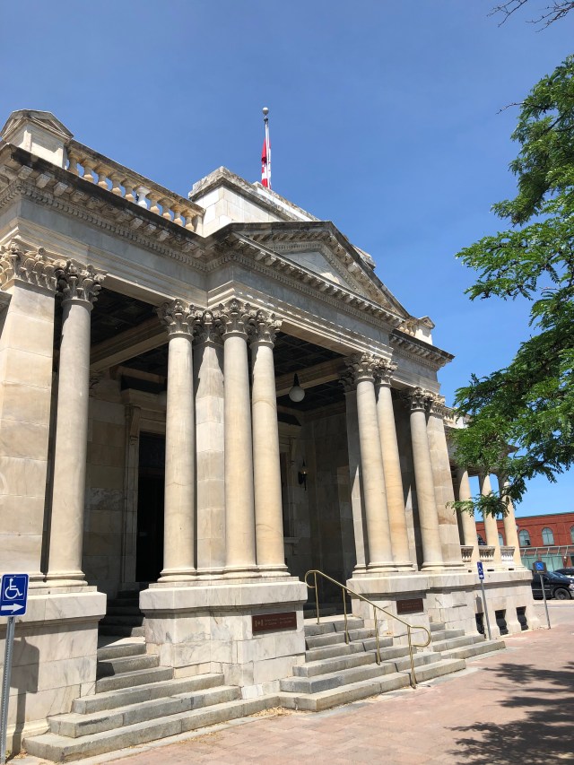 We met in front of the pillared commanding Service Canada building on the mai street, Hurontario.