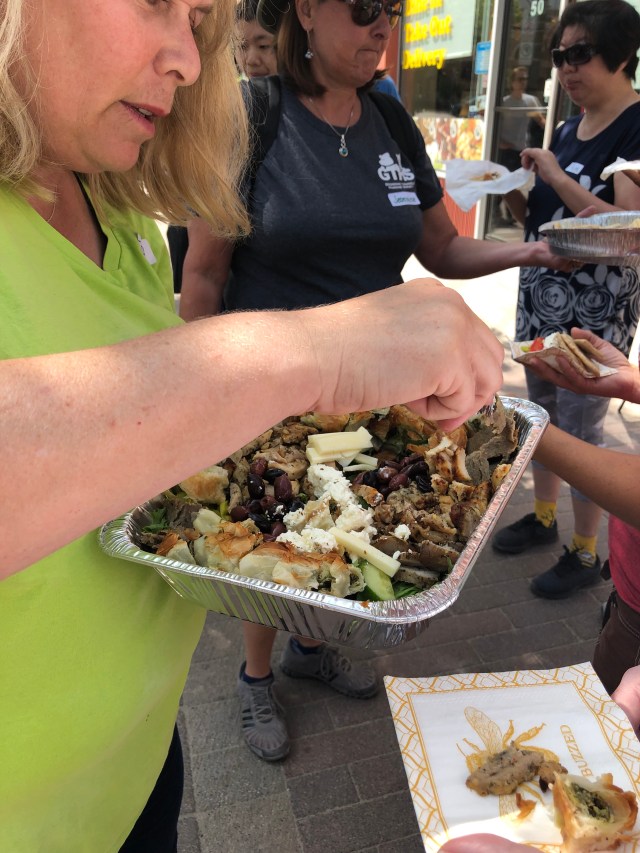 The first eatery featured was Fig and Feta. This family run Mediterranean style resto is in the process of moving from its current space to new and bigger digs right across from Service Canada. But they weren’t quite open. So the proprietor sent over a tray of samples which we munched on picnic style on the sidewalk. There was a delicious assortment of treats including spanakopita and feta and olives. Very tasty.