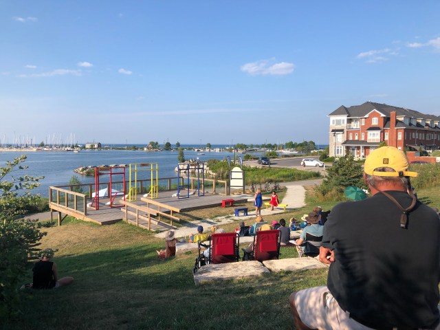 It’s about a 30 min bike ride – approximately 12 km each way. We ride 100% on the Georgian Trail so we don’t have to worry about traffic and distracted tourists driving around. The trail follows Hwy 26 (parallel through the woods) until you get to Cranberry Golf Club where we turn off and cross the Hwy to enter the Harbour St Trail branch. From there we veer off to the park and meander through the arboretum and along the shore to the stage.