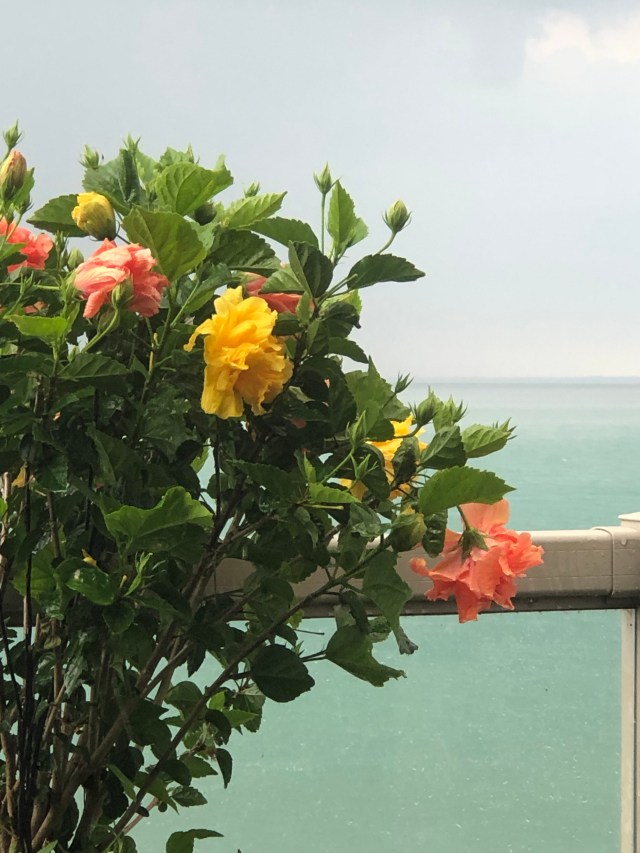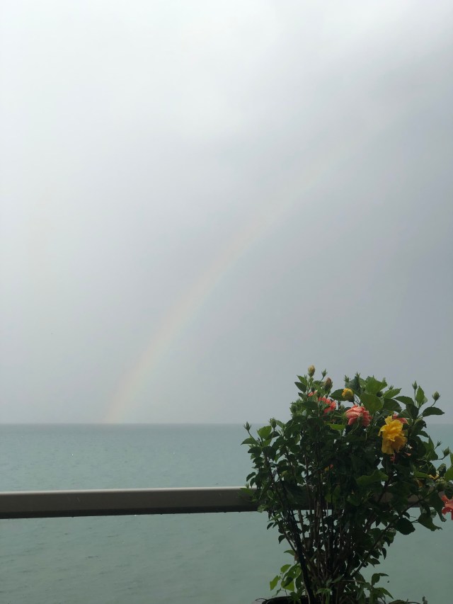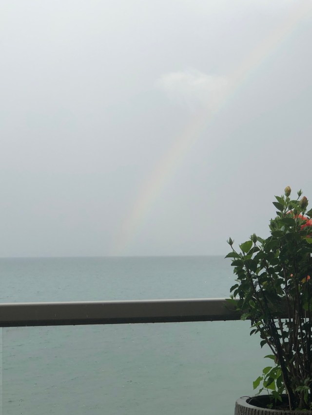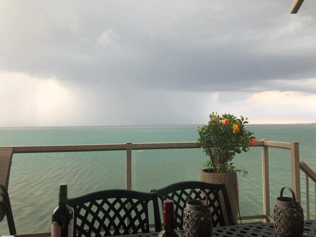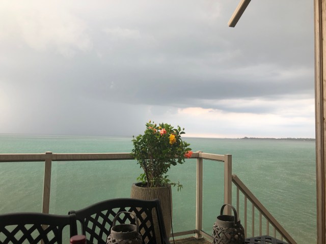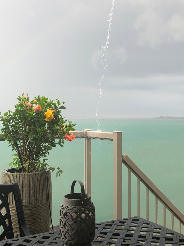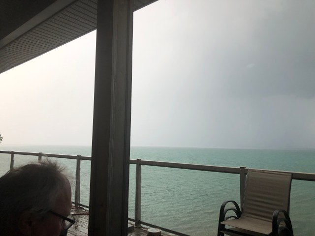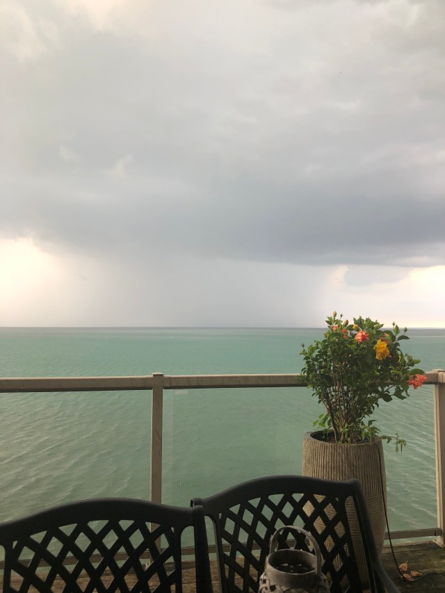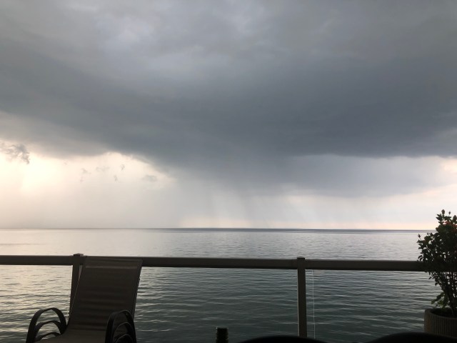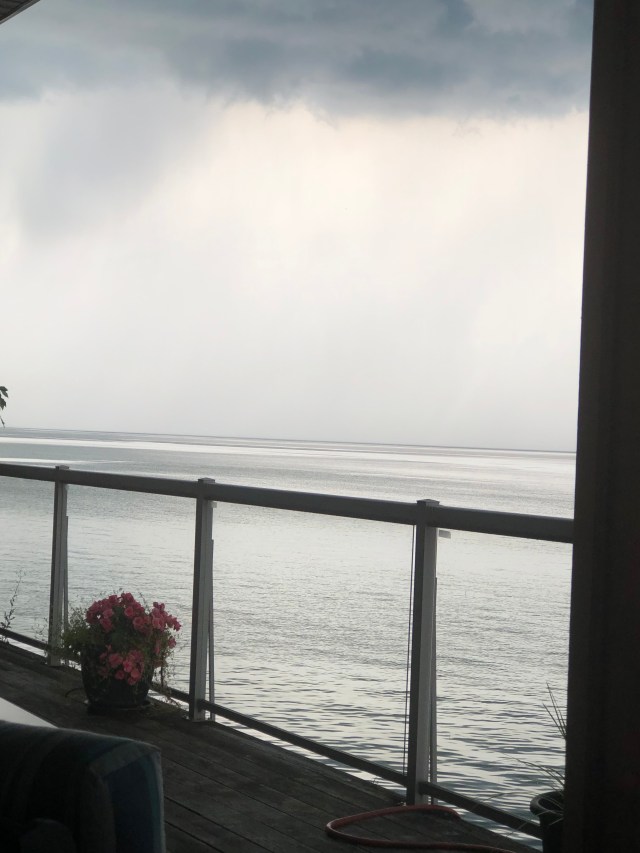 A breeze picked up. The clouds formed an angry dark blob and then the sound effects of crashing thunder and the blitz kreig of lightening began the storms symphony. Such a show of force and might. Complete with cascading showers and eerily calm bay. Too cool for words.