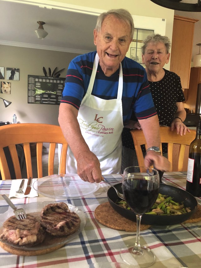 So the other day dad excitedly prepares lunch. Mom does the prep as her memory and vision loss makes it dangerous for her to cook at the stove. Dad puts on his Liaison College apron and fires up his cooking area. The grill is red hot (he’s making steak) and his frying pan is awaiting the chopped veg from moms cutting board. The table is set.