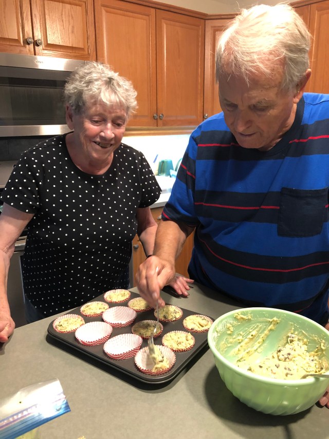 After our final card game ( dad is totally frustrated at the turn of events) we move into the kitchen and I supervise their baking duties. Dad is the mixer. Trying to tell him that over-mixing the dough will result in hard pucks instead of muffins is futile. All he heard was MIX. Mom is measuring zucchini. How many of these? Oh. Where do I put them? Is the bowl big enough? We never made these before. Is there enough room in the bowl? Mom. It’s all good. Dad? Do you want raisins or walnuts or both? Both. Ok. Here’s the stuff. Don’t over mix it …..