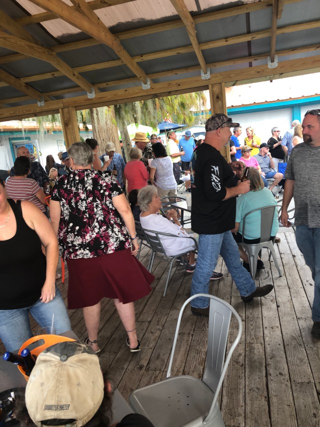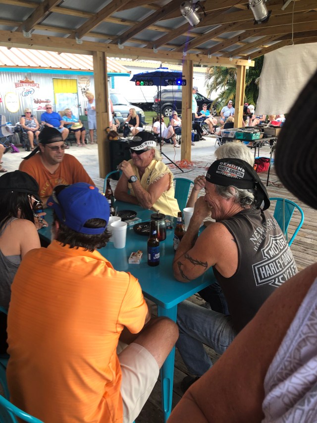 There’s people everywhere. All shapes and sizes. All white. Bikers. Beach bums. Older folks with mobility aids. We look at each other and wordlessly know what we’re thinking: WTF. We squeeze into the bar area (it’s a double wide with a lanai and a large outdoor covered patio) there are three (very sweaty) ladies tending bar and it’s jammed with people buying buckets of beer and shots to salute Frank E. There’s a small shrine set up at the end of the bar with a floral wreath and done photos and the paper to sign. Someone in charge of the guest book blew it ..the paper was not surviving the traffic.
