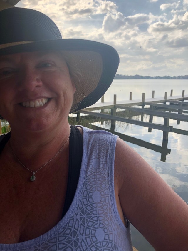 We decided to go. It was too hot to go for a bike ride or hike with Molly. 29C and sunny; perfect weather for a Sunday outing on the lake. We hop in the car for a 20 minute drive to Haines City. Very much like Davenport, it seems Haines City is more like an area than a city as we think of cities. Traffic lights. Downtown. Homes and businesses. The gps leads us to a remote road where various signs declare dead end. We shrug our shoulders and continue on. You can see by the digital map in my car’s navigation system that we are driving out to a peninsula surrounded by water. Also typical of this area.