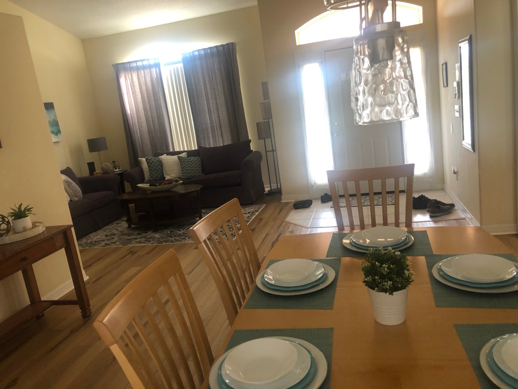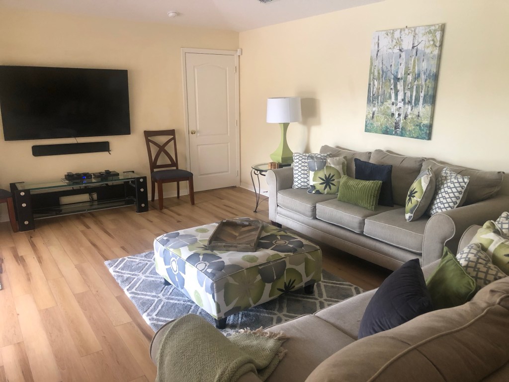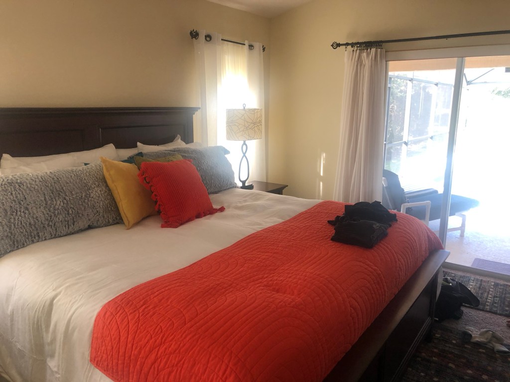 The interlocking walkway leading to the covered front door is tidy and a nice wooden bench sits in front of the entry under the stoop. I unlock the door excitedly. As I enter the home I am blown away! The owners (who bought in June 2020) have beautifully updated the entire place! As you enter there is an open living room and dining area and the master suite is on the left. Beyond the dining area is the kitchen and family room with walkouts to the pool. Beyond the kitchen are two delightful bedrooms with twin beds and a full bath. At the very back of the house is another master suite with an en suite and walk out to the pool. The colour palette is a soothing pale yellow in the walls and the furnishings are new and fitting. But it’s the accents that make it all flow. The owners have chosen colourful art and pillows to highlight pops of colour. And the lamps and other accessories pull the look together. It’s what you see in magazines or flyers for Kirklands.