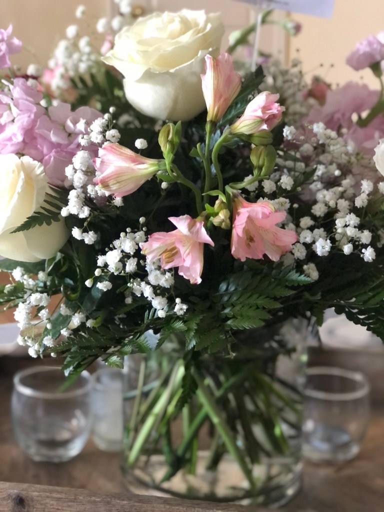 A big basket of pamper me supplies including bubbly, chocolates, bath bombs… an ideal kit for a chronic bather! Thanks to my sister who diligently arranges family gifts on behalf of everyone. It’s her knack. It’s nice being on the receiving end. Then the florist came again. I say again because Rudy had a dozen gorgeous roses delivered a day ago. Today’s delivery was a stunning arrangement in light pink and white from my friend ShariLee. A really nice surprise!!