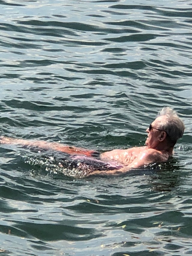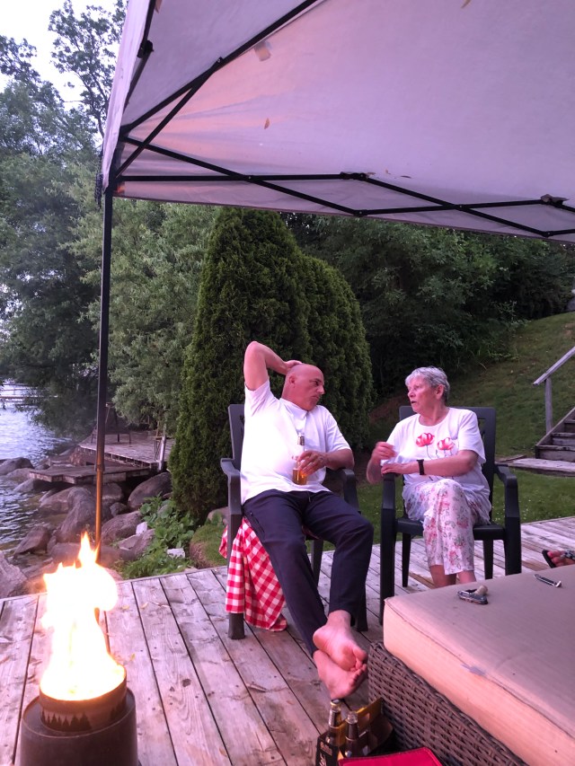 Frank tells us about ice fishing in the winter. The lake freezes so thick that cars and trucks and skidoos and huts take over the landscape. Hard to visualize in the heat. We all agree that it’s a very Canadian hobby and a must to include for winter survival. Now that I have the option I choose Florida. No more freezing winter. That’s the beauty of retirement.