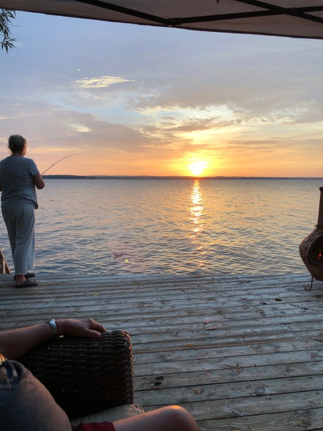 But in the evening we venture to the dock to watch the sunset. As we lounge next to the water you can feel cooler in your mind. This is when my sister decides to fish. While the rest of us are taking in nature’s beauty and tranquility she randomly decides its time to angle. She has a license so it’s obviously a notion that occurs with some regularity. Who knew.