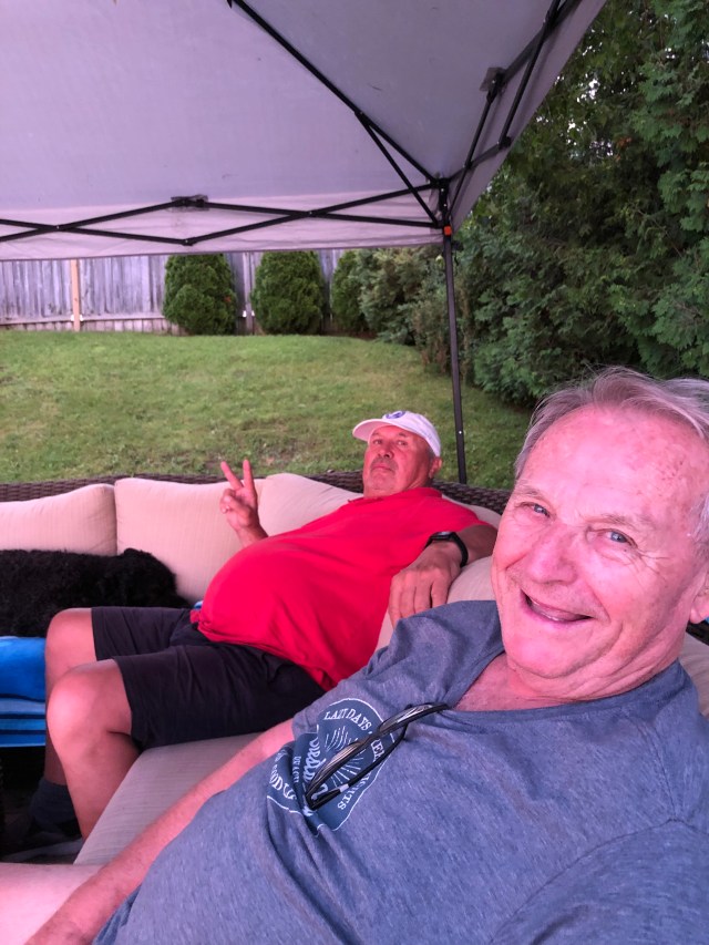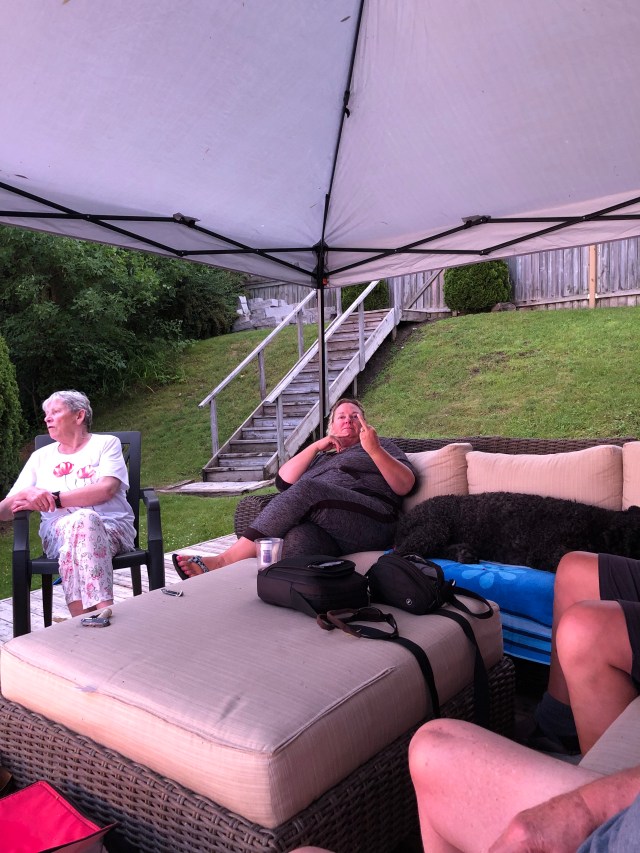 Since it was Sandy’s birthday we secretly arranged to have a little party with cake st the bbq. When we arrived at Jim and Betsy’s place the back deck was in Birthday theme complete with banners and balloons and accommodation for Molly. (This is such a generous gesture for nondog people … ❤️) Jim and Betsy put on a fabulous steak dinner and were such gracious hosts. After dinner we piled back into the car and I dropped the gang off to the TiCat football game.