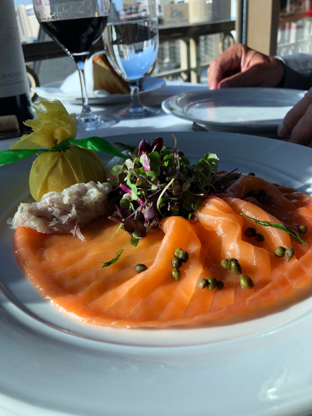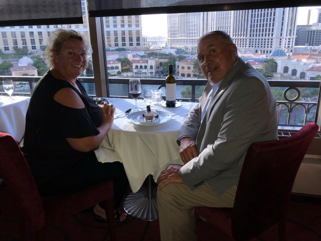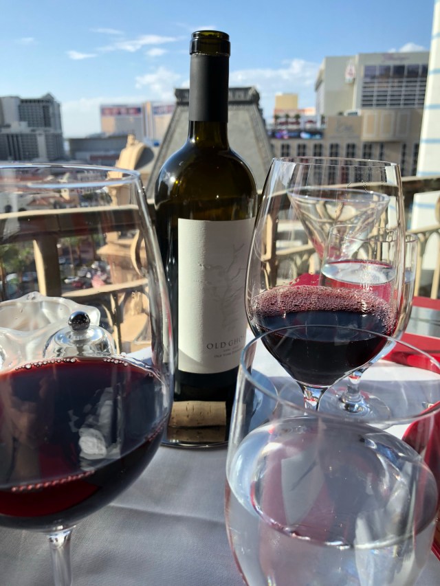 Dinner for our actual anniversary was booked at Hugo’s Cellar in downtown Vegas. We started the day by exchanging cards and read our sentiments aloud. (A personal vow renewal?) and ended the day with a delicious meal served in the old-fashioned steakhouse way with a rose upon arrival and table side service. And if course another stellar bottle of wine.